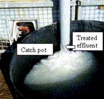 The structures above each tank allowed clay slurry to be added to individual tanks, and were also the discharge points for the treated effluent on the emptying cycle. The treated effluent from each of the tanks was discharged to a catch pot (Photo 2) to allow readings of dissolved oxygen, temperature, pH and conductivity to be taken using meters.